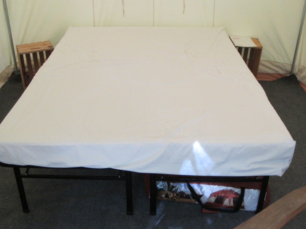 Amenities include a tent with a queen sized memory foam bed, two adirondack chairs, a portable fire pit, small table and food storage bin. Flush toilets and running water were a short walk away, and there were also plenty of vault/portable toilets. If you have a larger camping party, there is an additional tent tucked under the bed.