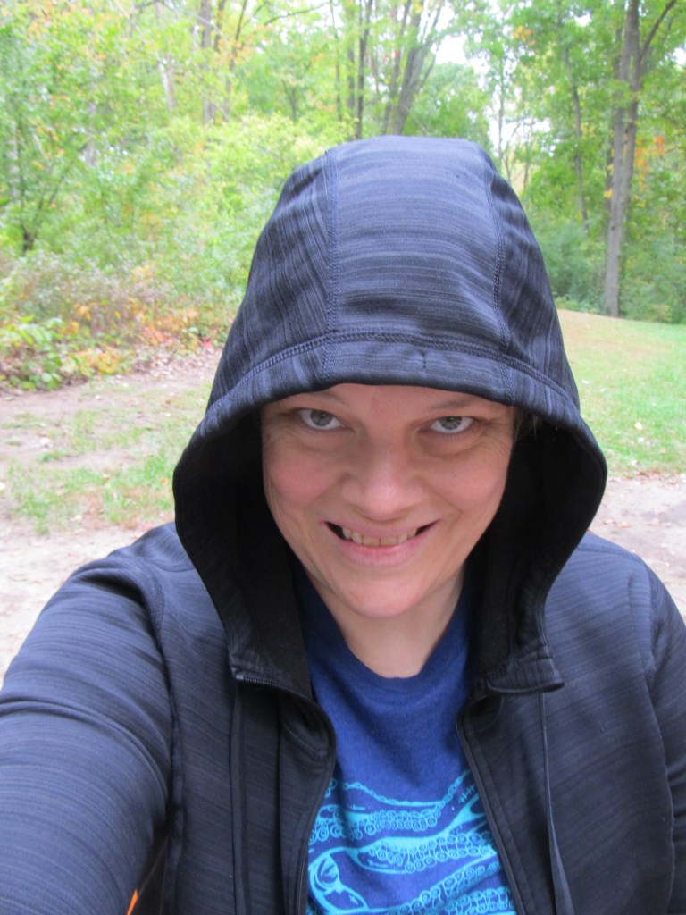 Outside the cabin, I really enjoyed the private area we had for our campfire and picnic table. Our cabin (one of three in our section) was at the end, so we had only the woods on one side of our cabin. I enjoyed chilling out in my reclining camp chair and listening to my “jams” on my little mp3 player and battery powered speakers. I also made a noble attempt at a “creepy” selfie:
