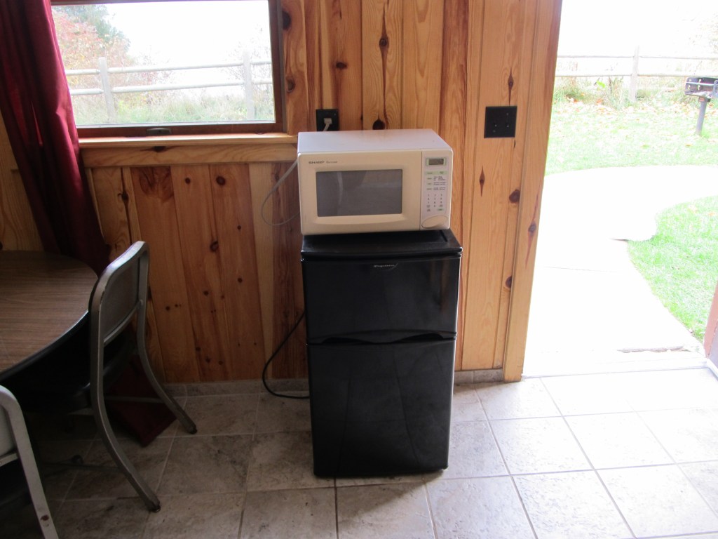Our first night – we arrived sometime between 6 and 7 p.m. with a pizza from a nearby Pizza Hut, which was going to be our night’s dinner (we like to have “lazy dinners” our first nights of camping). We started hauling in our gear to the cabin, and then we realized…