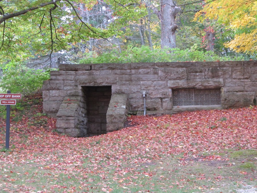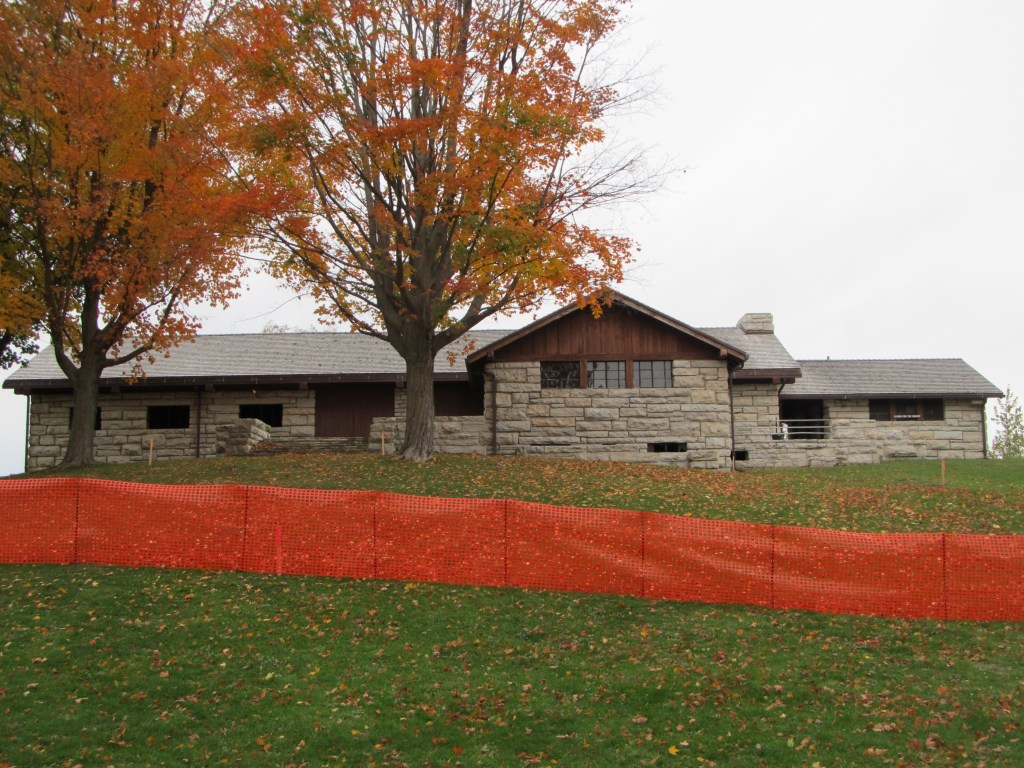 As further evidence of erosion and rising waters, a historic building designed by Ernest Hartwick (for whom I presume Hartwick Pines State Park is named) and built by the Civilian Conservation Corps in the 1930s is sitting dangerously close to the shore. The building is going to be moved to a day use area farther inland, which I’ve read is a $1 million project. The work to move that building was to begin the day we were going to leave – so we took one last opportunity to get some pics of the lovely historic limestone building: