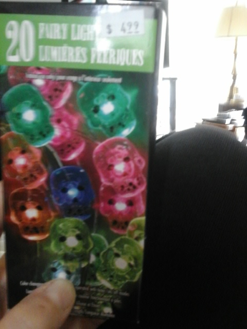 I now have three different types of battery-powered Halloween string lights. Flashing pumpkins, basic orange, and as of today…color changing skulls! I bought four packages of the skulls today in a curbside order at one of those fly-by-night Halloween stores that set up shop in vacant retail spots this time of year. Behold a sampling of my lights: