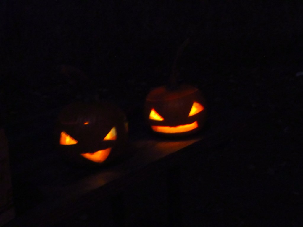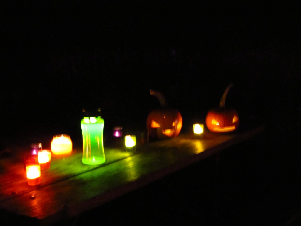We also had a good “light show” going on outdoors on our picnic table – I had a bunch of tea lights, a scented candle, a LED light and the stars – Tweedle Pump and Tweedle Kin – our wily pumpkin duo.