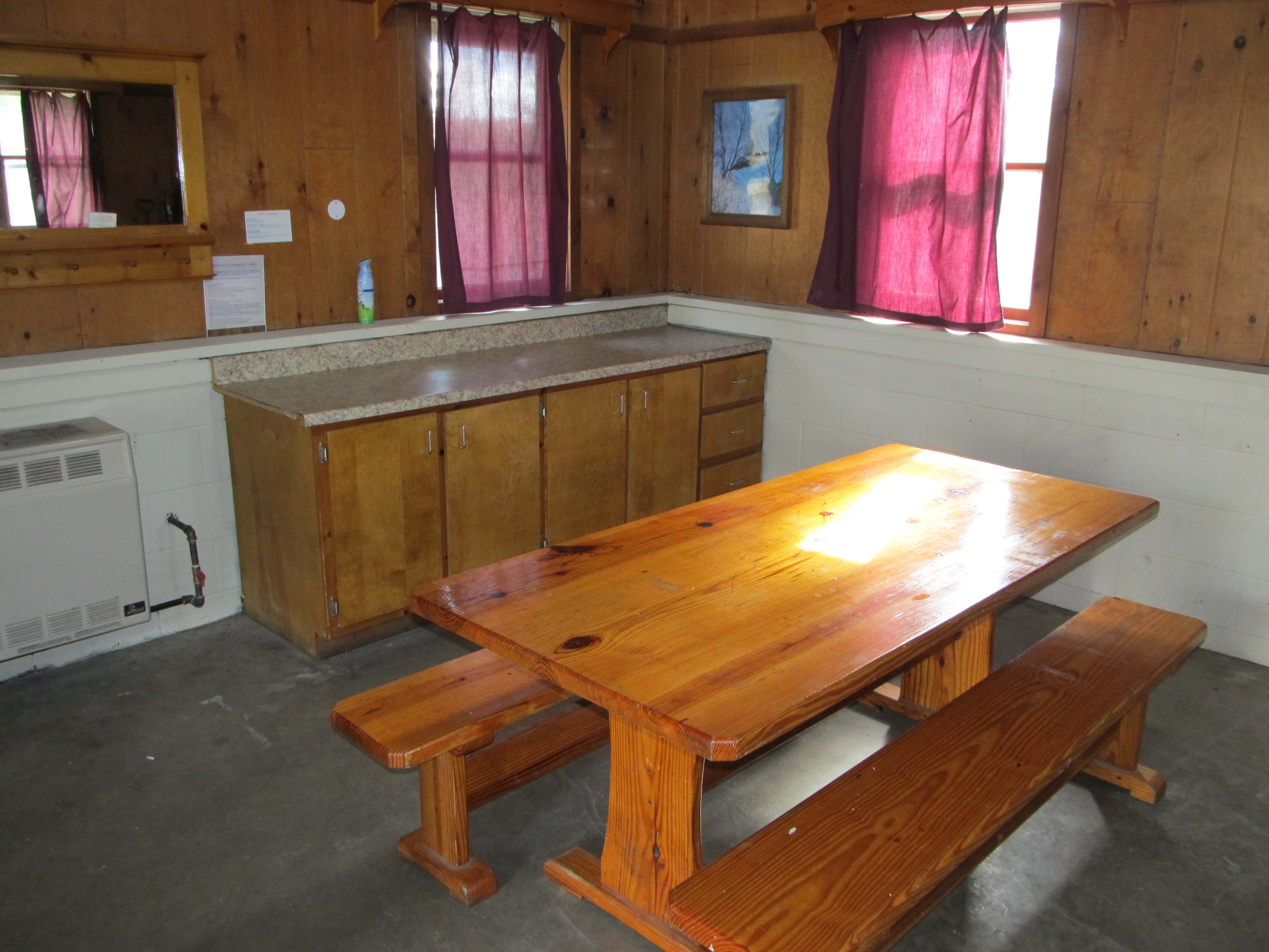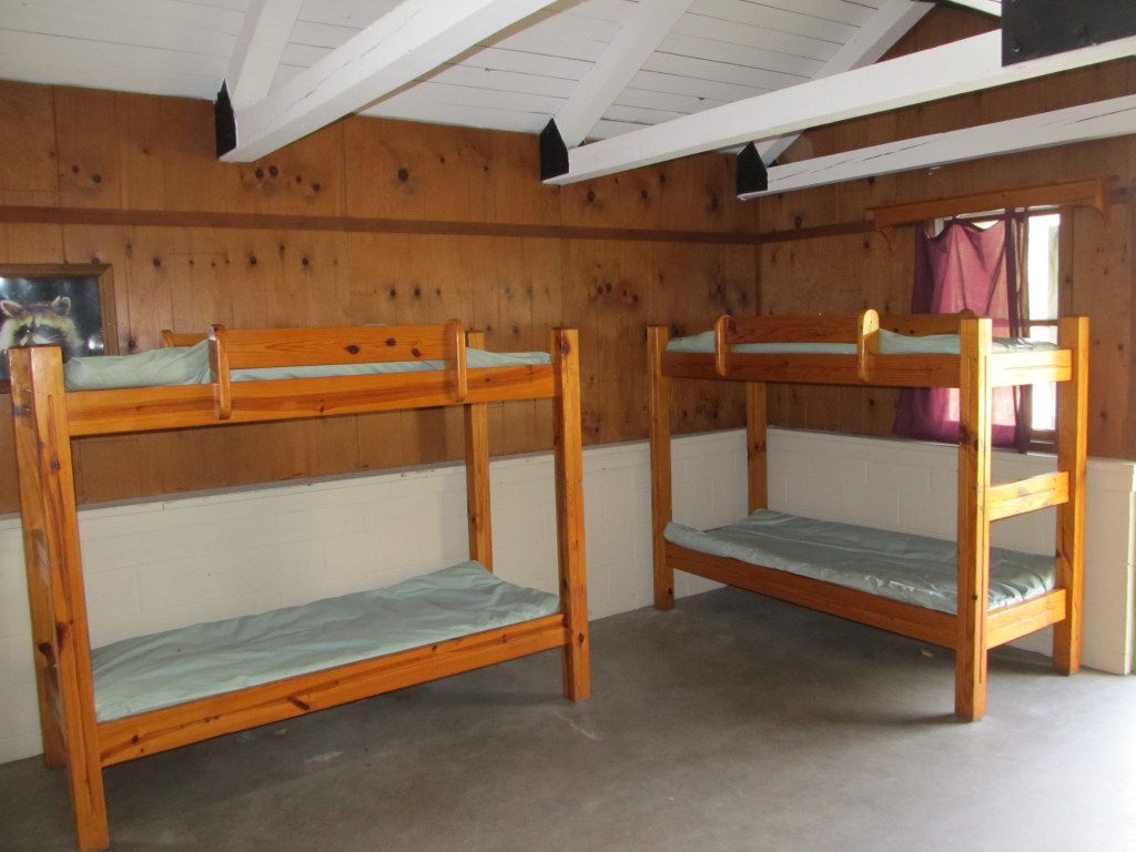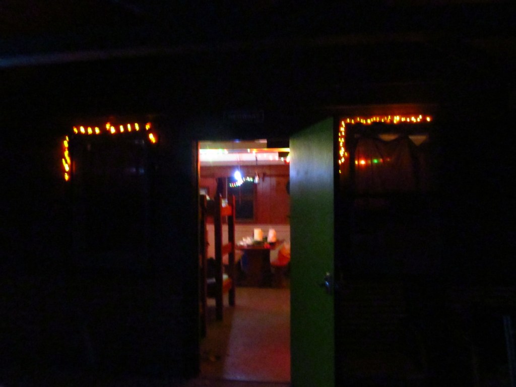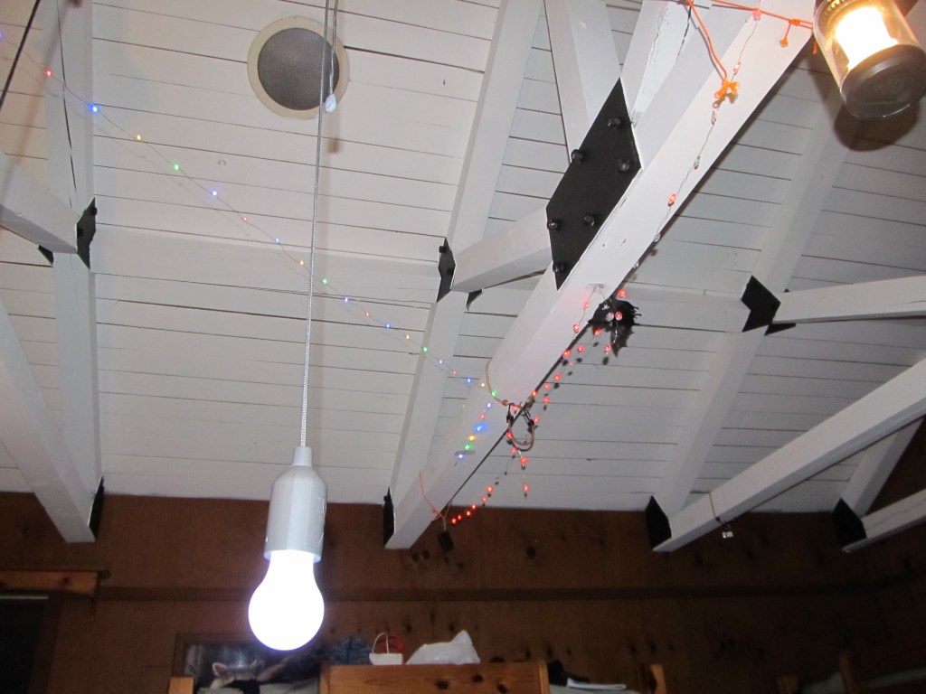 I set up the string lights on the inside rafters, set up the sleeping bags on our bunks while Mike got the campfire started outside. As much as I like to gripe sometimes about being tall, I really do have to admit that being tall IS kind of awesome when you’re doing things that require reach! I did need to step on a chair for some things.
