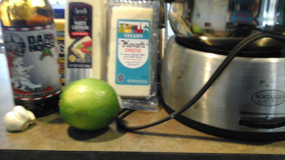 Beer is one of the essential ingredients in the fondues we make, though other types of booze are often used too – such as wine, hard cider, liquor, etc. You can even use apple juice or sparkling beverages if you’re a teetotaler. My husband likes to use beer and at least a smidge of some kind of liquor – two types of cheese, a few drops of lemon juice, and some thickener (flour or corn starch). We use vegetables, cubes of meat and breads to tip into the cheesy goodness.
