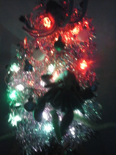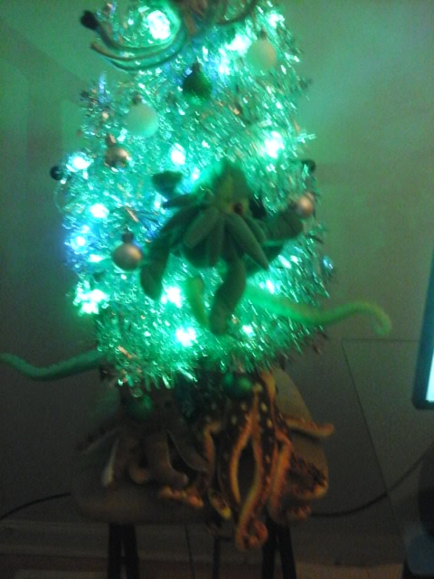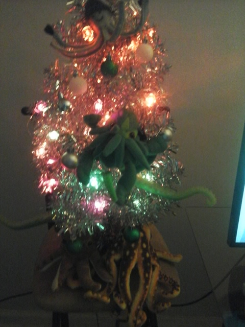 I brought up the tiny tinsel tree from the basement, cleaned up a corner of the living room, set up a barstool, bungeed the tree to the stool to keep it upright (yes it’s bungeed upright call me Ms. MacGyver) and put up some battery powered lights (color changing skull lights I bought for Halloween). I also assembled some plush cephalopod toys and rubber finger tentacles to give the tree a “theme.” My beloved husband seems happy with my handiwork (ho ho fucking ho, deck the halls, yada yada):