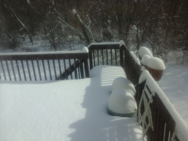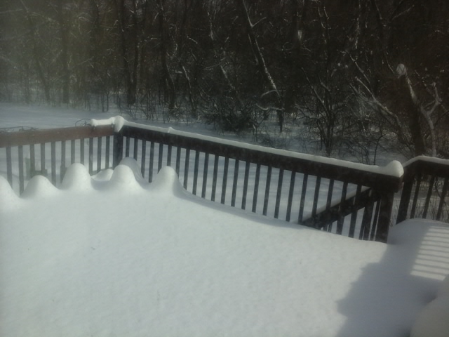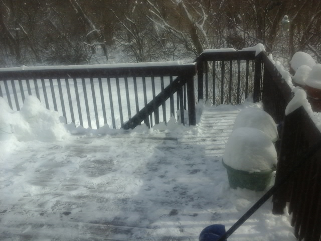 Perhaps giving me a little extra motivation for my task was seeing a bunny hop off from underneath my neighbor’s deck to the woods – plowing a path in the snow that was taller than it. Now – if that scared little bunny could do that, then certainly clearing 18 inches of snow off my deck would be no problem, right?