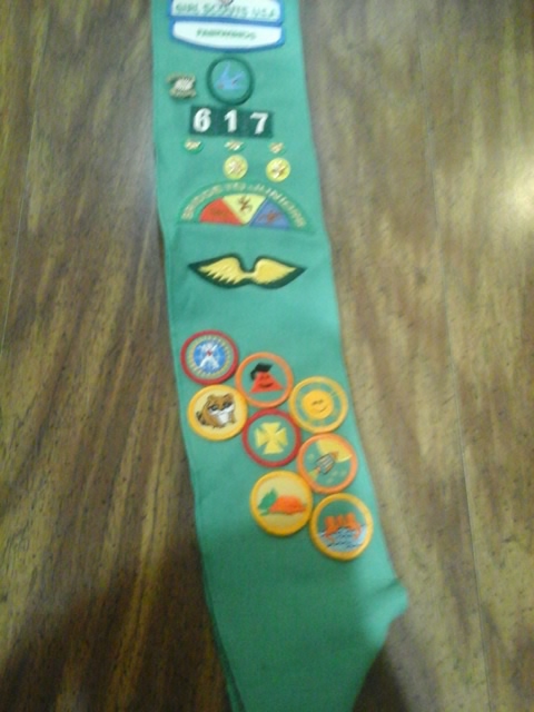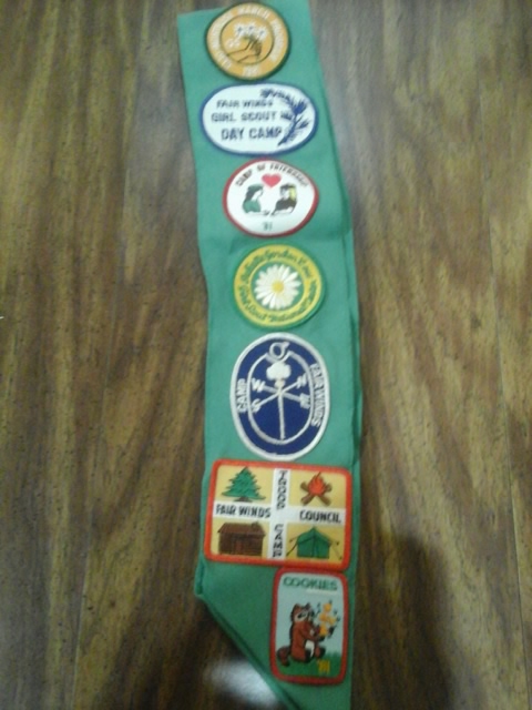 While I was going through desk drawers two days ago, I found my old Girl Scout sash and patches! I was actually looking for those a few years ago, because I wanted to show them to a friend of mine whom is a Girl Scout leader. Behold my old sash from the early 1980s: