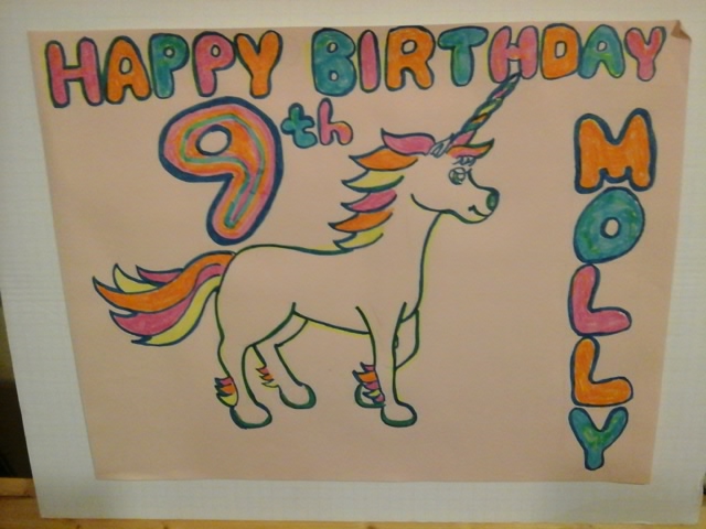 We were invited to a couple of “drive by” birthday parties for our friends’ children during the pandemic. My husband and I teamed up with this art piece – he took all of five minutes or so to sketch out this unicorn in pencil – and I colored it in and did the lettering. Does this make me an “inker” in comic book parlance?