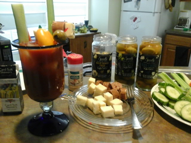 Did a bloody Mary spread and made cheddar ale soup today for my husband’s birthday today. Bloody mary cocktails are all about the garnishes, aren’t they? Used V8 as base and Stoli cucumber to spike it (husband loves cucumber). Made a spicy mix, milder one for him. Garnishes include celery, carrots, cucumbers, sweet peppers, dill gerkin pickles, three types of olives, two types of cubed cheese and tomato basil chicken sausage. Cheers!