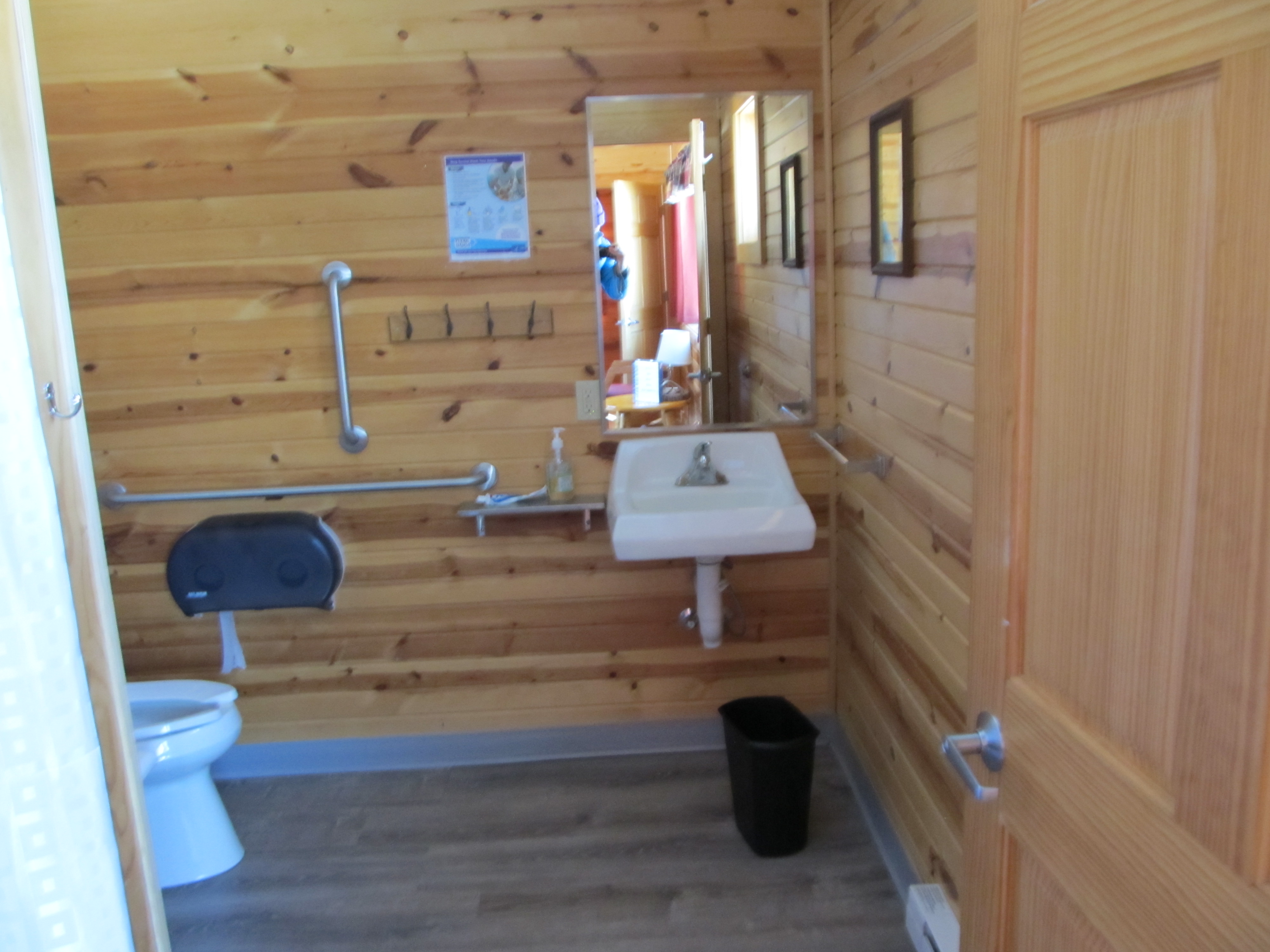 Inside, you have radiant heat in the living room, bathroom with shower (yes you read that right – a cabin WITH a bathroom inside), and also in both of the bedrooms. Each bedroom had a full sized bed for a bottom bunk, and a twin sized top bunk. Be careful if you’re using the bottom bunk, it’s pretty low clearance even if you’re not Amazonian in height like I am! Thankfully I didn’t bump my head accidentally. Here are a few pics of the cabin interior (after we’d cleaned our stuff out):