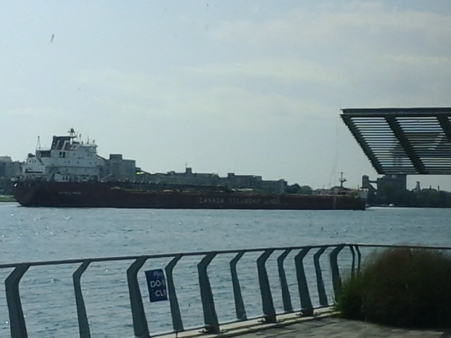What’s funny is that while we’re marveling at the scale replicas of ships from history, we got to see a REAL ship! My husband got all excited and ran to a huge window in the back of the museum, which is obviously there for purposes of watching Detroit River traffic:
