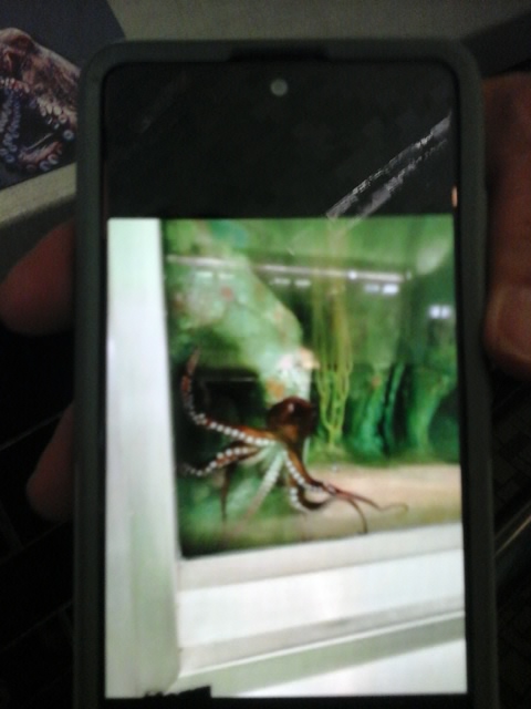 The aquarium itself was very, very crowded, and visitors were kind of routed through there like cattle in an abbatoir. Sorry if that’s too dark of a comparison for you. However, one of the aquarium workers was kind enough to keep the glass squeegeed off on the octopus tank to made her best attempts to point out the shy creature to us. While I wasn’t able to get a pic of my own with my crappy tablet, she let me take a pic of a picture she took on her camera (interestingly enough my tablet camera did catch an image of the actual octopus’ tentacle):