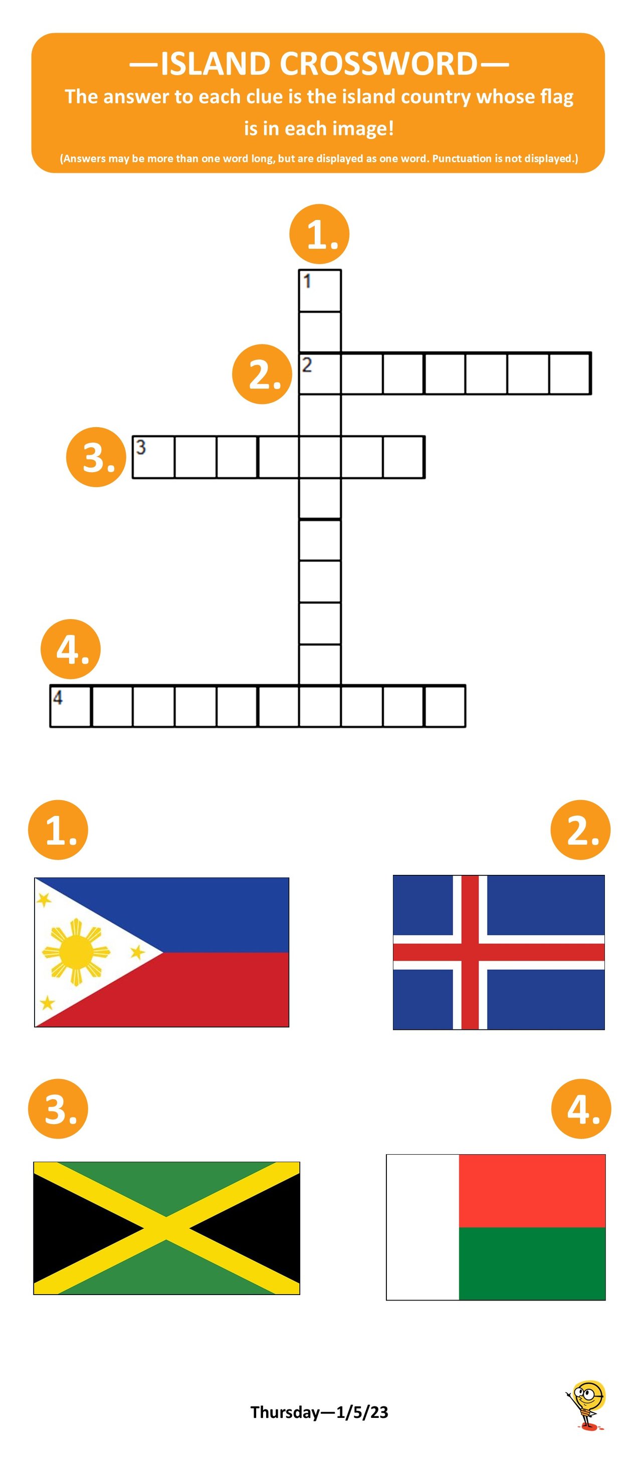 We only got two of these correct. We have not been doing very well on crossword – or flags – rounds lately. We were in second to last with 39 points.