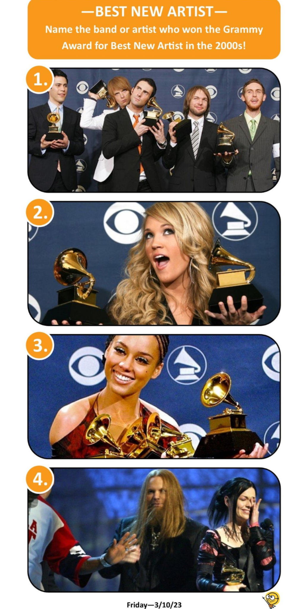 We mmissed every one of these. We honestly don’t know the difference between Kelly Clarkson and Carrie Undercarriage (don’t correct me)! And doesn’t everyone like to rip on band #1? Also, we thought woman in #3 was darker skinned, add to that us having no fucking clue who #4 was, and total mystery round FAIL!