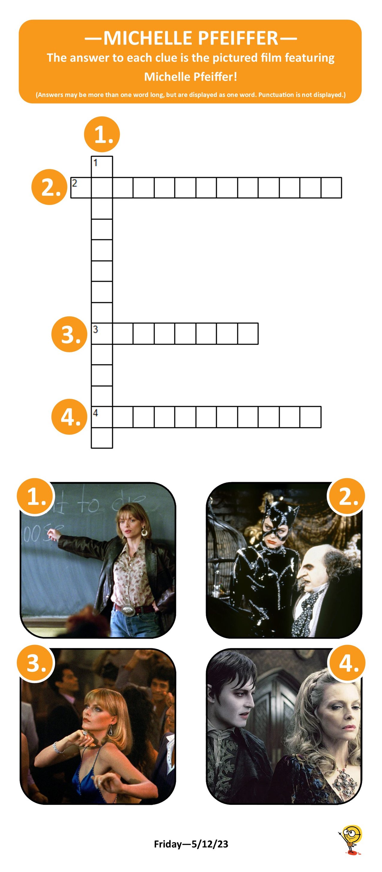 The answer to each clue is the pictured film featuring Michelle Pfeiffer.
