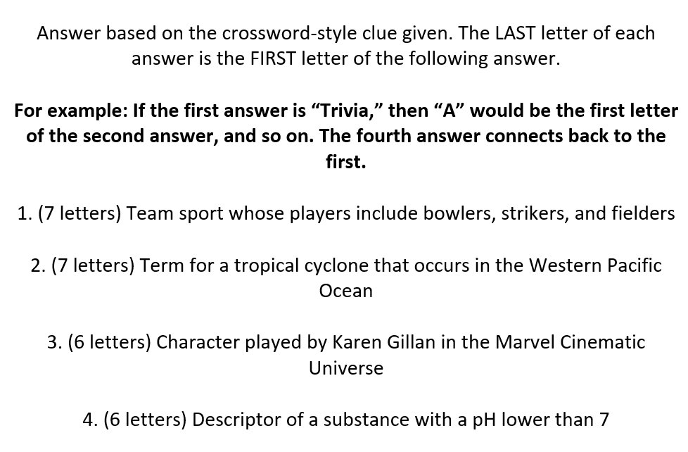 For this mystery round, your team can give four answers and can put them in any order you choose. Teams will receive two points for each correct answer.