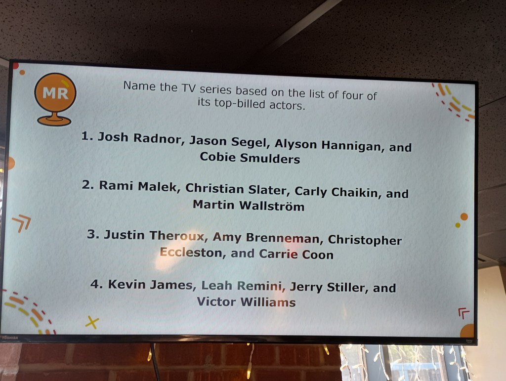 And here were our questions, some of which we got correct! We even got a question correct about “How I Met Your Mother!” Only because one of the actors from “Buffy” is in it!