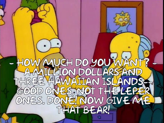 Speaking of 1990, here’s a meme from “The Simpsons” (the episode where they’re trying to get Maggie’s bear back, and yes there is a point to this image):