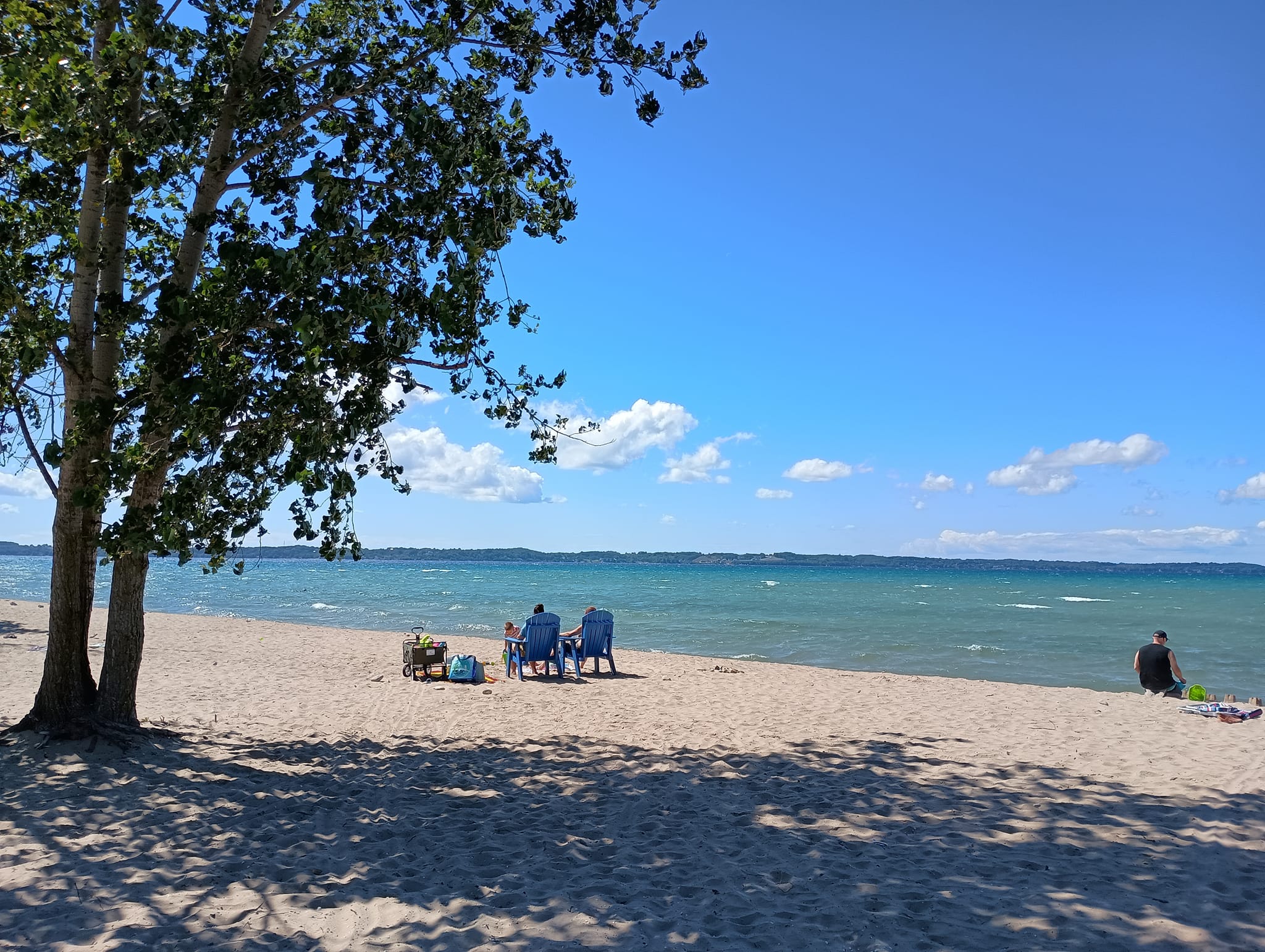The next day, the skies were full – but not TOO full – of fun, fluffy white clouds, the sun was shining brightly, there was a light breeze (except on lake MI, more about that in a bit) and it wasn’t muggy or too hot – so we decided that it was a perfect “beach day.” We visited a municipal park (William Good Day Park, search for that in Google maps) located on the northwest side of Torch Lake to check it out, here are a couple of pictures: