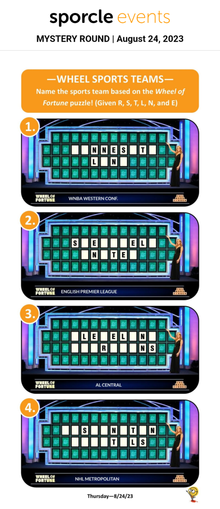 3 Movie Couples – Name one of the two films in which Owen Wilson and Rachel McAdams play a couple on screen. Both for a nerd bonus point. No teams got both parts correct, we’d never even heard of the other film.
