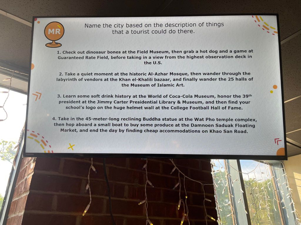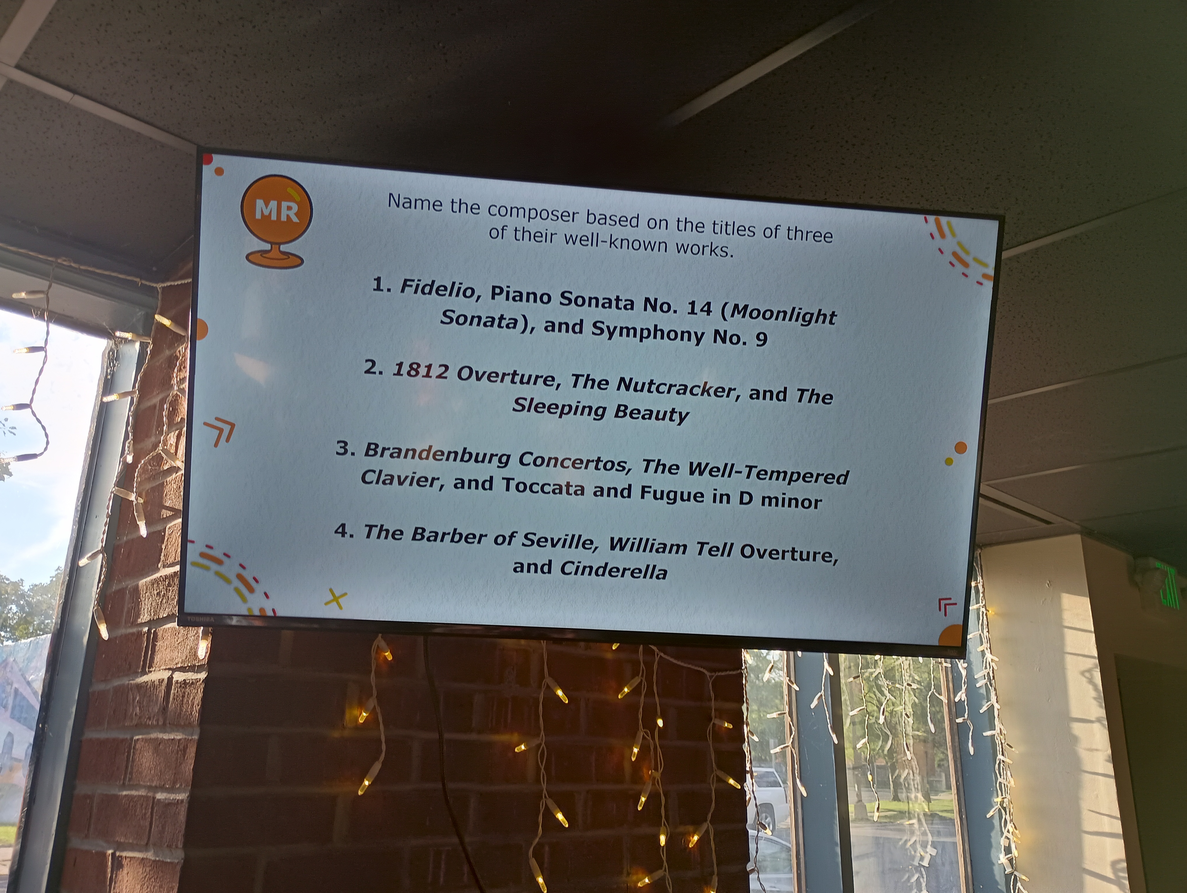 No teams got it correct, but because of our having missed all of the eight points available in the game one mystery round, we couldn’t overtake the first place team. It was one of “those” mystery rounds where you pick John Lennon instead of Paul McCartney, burnt umber instead of burnt sienna, Harriet Tubman instead of Frederick Douglass, where you pick zig instead of zag (you get the point). Guess which of these either/or scenarios actually came to pass during the game?
