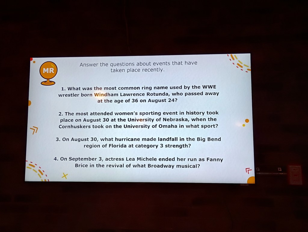 I took some pics of some of the questions and mystery rounds, so I can share those now! Enjoy…
