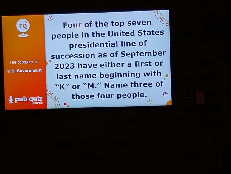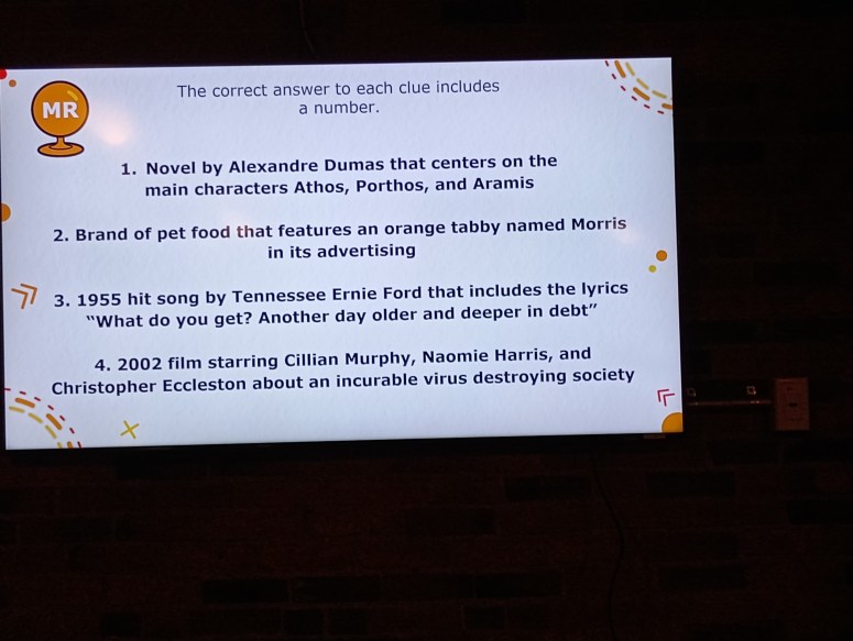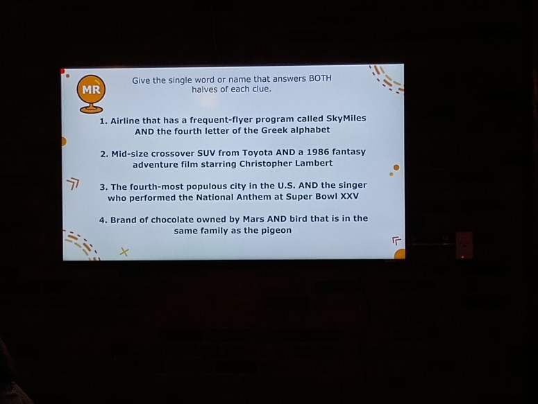 We had a whopping five players come out for a live trivia game last week at Sticks, a bar so named because of its pool tables. It’s also kind of a sports bar, and a place where you can watch professional sportsball games while you get your trivia fix!