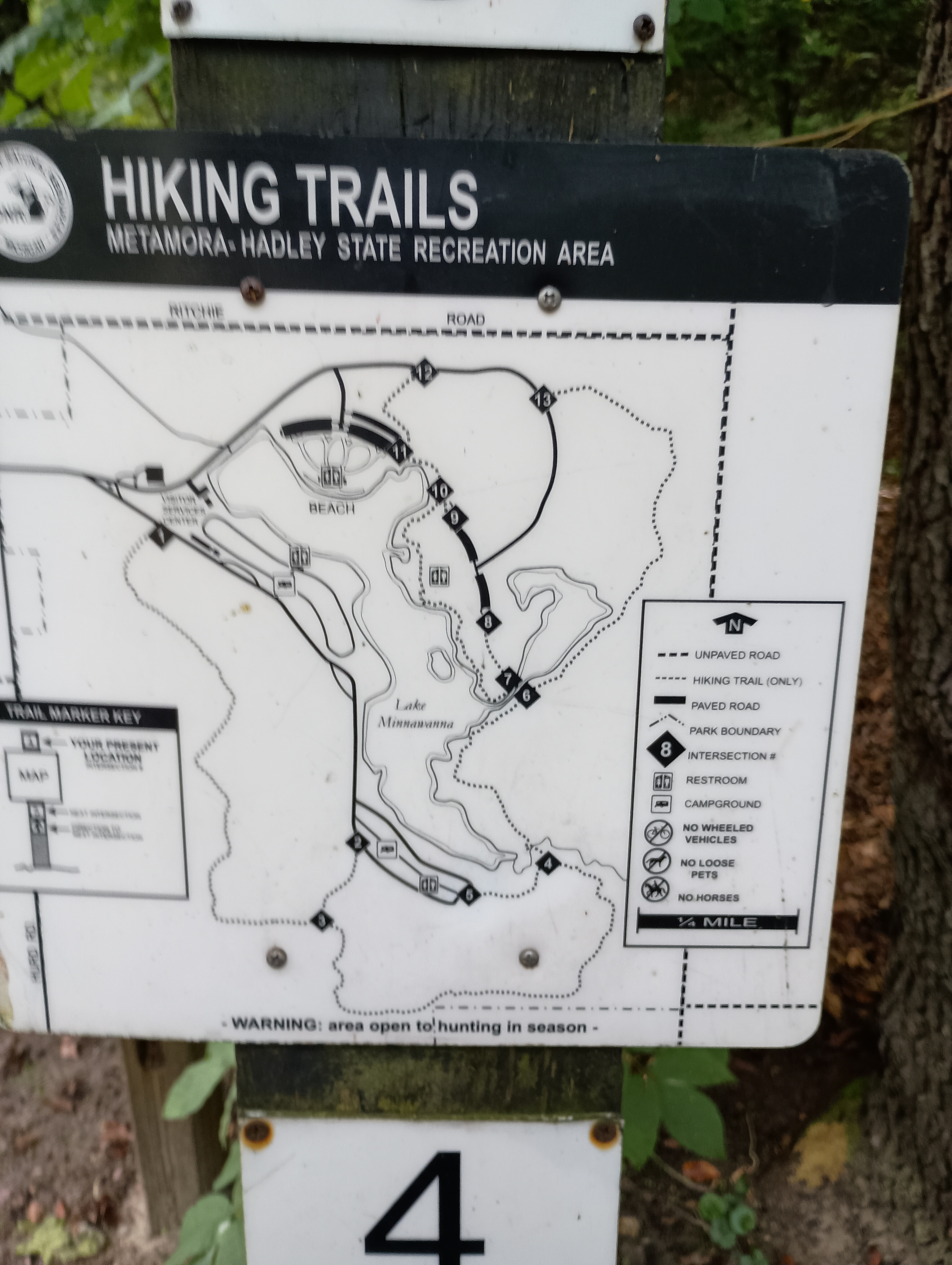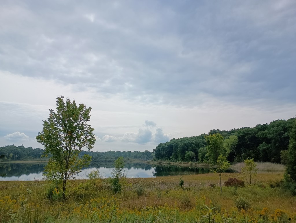 The next day, we had a nice breakfast in Lapeer (Apple Tree Restaurant, which I highly recommend) – I had oatmeal with blueberries and walnuts and turkey sausage, he had potato pancakes. When we got back to camp, with our carbs nicely loaded into our bodies, we hit the trails! There are more than six miles of hiking trails at this park, and we did a lovely hike around the entirety of Lake Minnewanna, an artificial lake created by a dam.