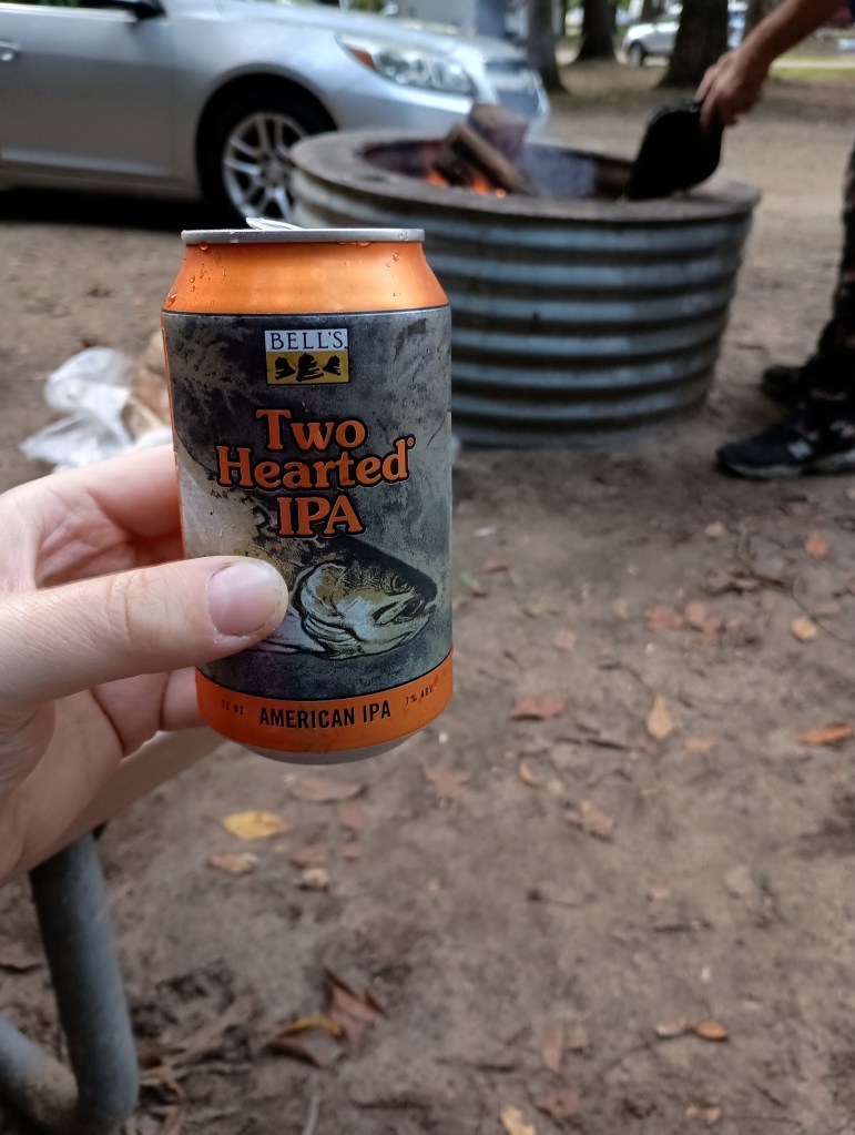 The camp site we were on had its quirks! It was pretty unlevel, so much so that our picnic table was on a slant, and so was the little charcoal grill! Since I had no decent place to cook dinner with our little backpacking butane stove, we went to Hungry Howie’s to pick up dinner. And after that, it was “drink ‘o clock!” I cracked open a Bell’s Two-Hearted, and determined it to be the “unofficial beer of Michigan campfires.”
