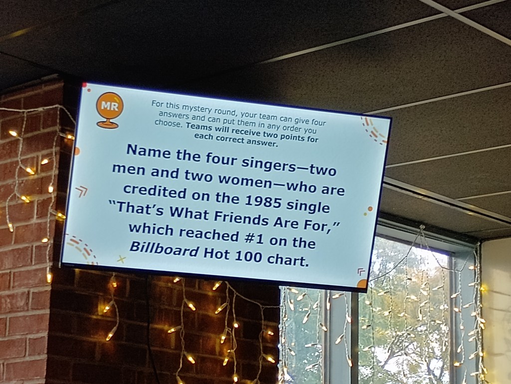We were in fifth going into the final with 45 points. We wagered just five points on the category of 20th Century Literature in the hopes that…yeah I’m not sure what I was thinking! π