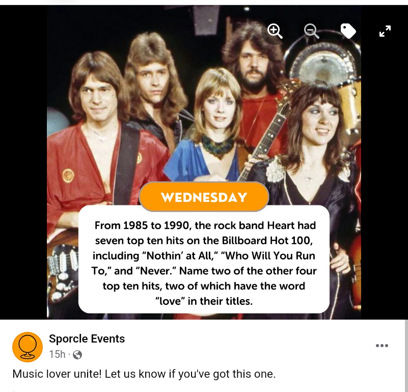 Damn it, I woulda totally knew this one! And this sparked a lively conversation between my husband and I about how the music of the rock band Heart magically appealed to fans of metal and hard rock – and also appealed enough to fans of pop. And who didn’t love their videos in the 80s? Who knew that a couple of male Heart members resemble Benny and Bjorn from Abba?