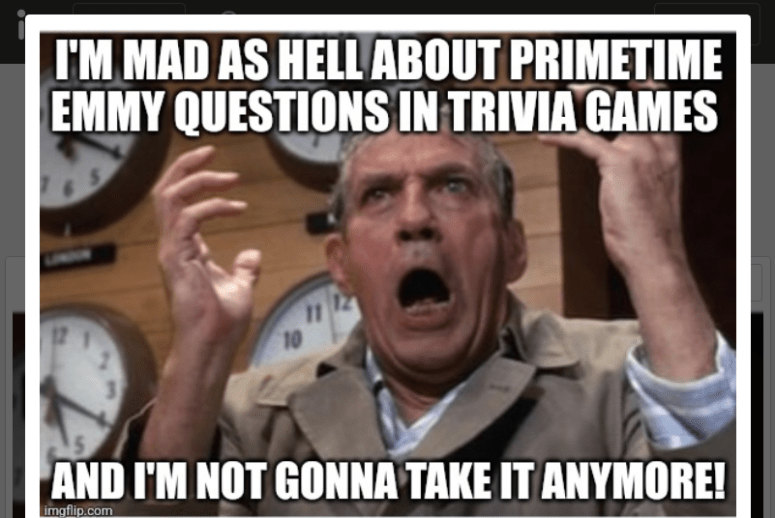 Primetime Emmy Awards (yikes)! When I walked into the lounge from the bar area to see the final question and saw that it was about Primetime Emmy Awards? I burst into a bit of insane laughter…Guess I didn’t miss any potential points!