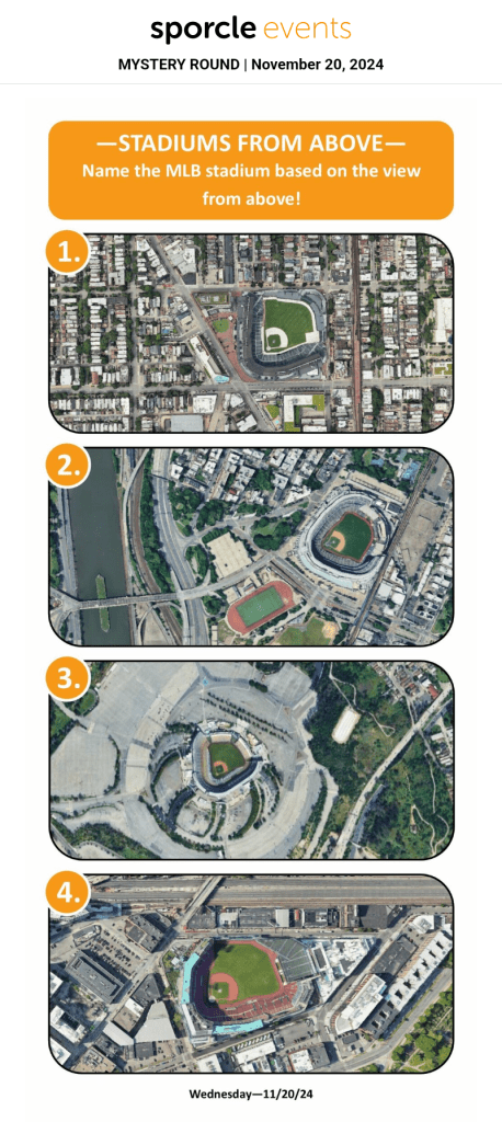 This round was doubly hard because even if you thought you might know the right teams, you’re screwed if you don’t also know the stadium name. Lemme think – Roger? No? Timothy? No? Yeah we put “no idea” for every one of these, though I could have put “Wrigley Field” for all four and have maybe a 25 percent chance of getting at least one right! Yes, we’ve done this in desperate moments in mystery rounds!