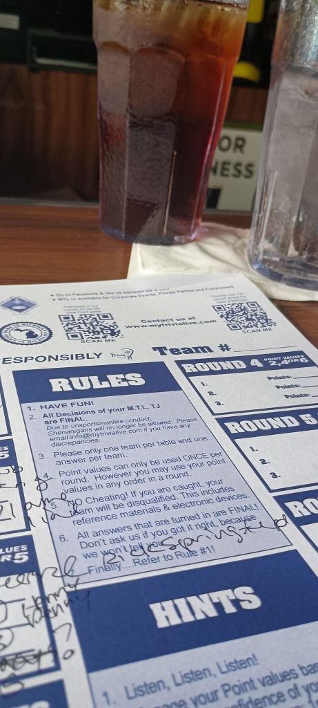 May 3, 2025 by heb23 How Nice To Be Casually Late For A Trivia Semifinals! Sitting in on semis game. Showed up around end of round one! Share this: Click to share on X (Opens in new window) X Click to share on Facebook (Opens in new window) Facebook Like Loading... Related