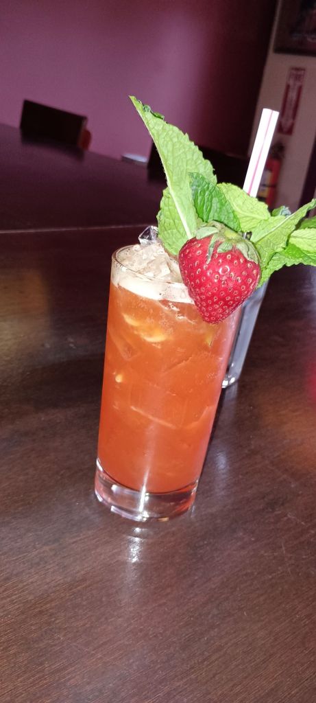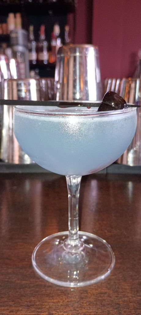 The blue one was mine, and is called an Aviation. The fruity one was my husband’s, and was a Pimm’s Cup (the official cocktail of Wimbledon).