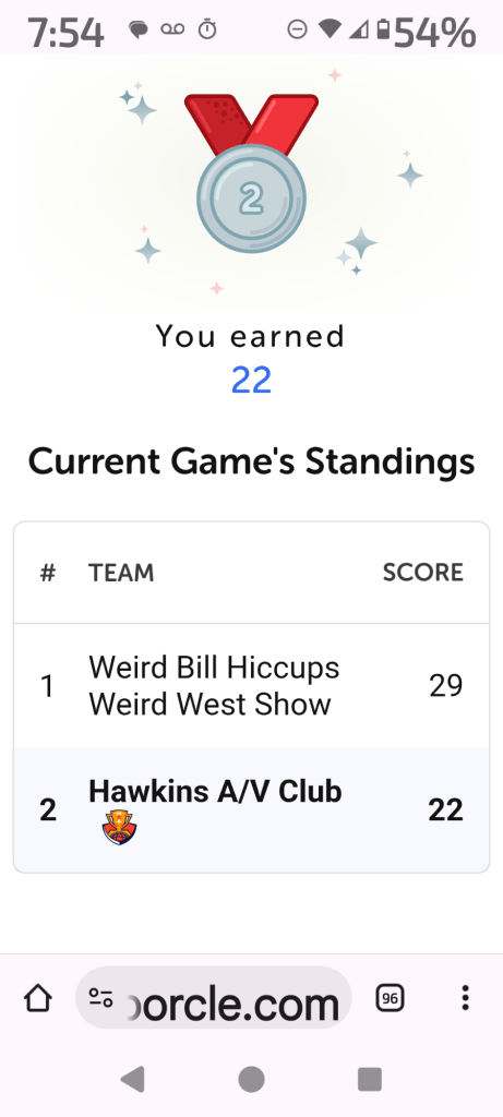 14 Characters – What character is revealed to be Vecna late in season four of Stranger Things? Our host was very, very lenient on this one – my guess was “friendly orderly slash number one slash played by Freddy Krueger actor son.” He actually is listed as “friendly orderly” on the imdb site! Had she been more strict though, we would have had to provide his given name. Thanks for the leniency!
