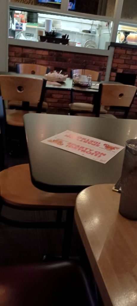 Benny’s Pizza set up tables in a creative way I’ve never seen in a trivia tournament before. Extra small tables were added to the ends of the booths to add fifth seats. This worked out well for us since not everyone on the team is a fan of sitting in booth seating! I managed to have a whole booth seat to myself (though I had to share space with a couple of winter coats) 😁!
