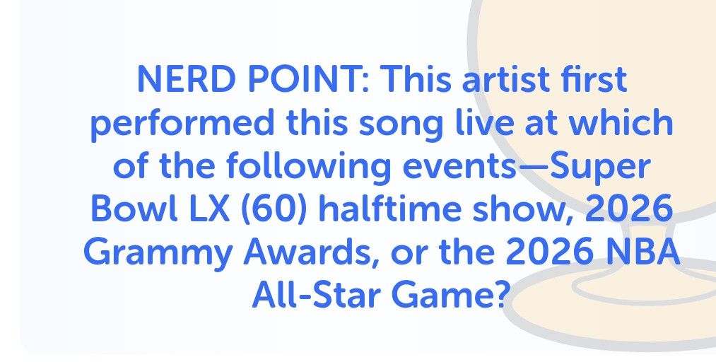 We couldn’t think of any other hit songs of hers for the nerd point, so I put in “Bare Midriffs and Body Shots” for a joke answer. Good song for a Natalee Holloway biopic? 🤔🤨 Too soon?