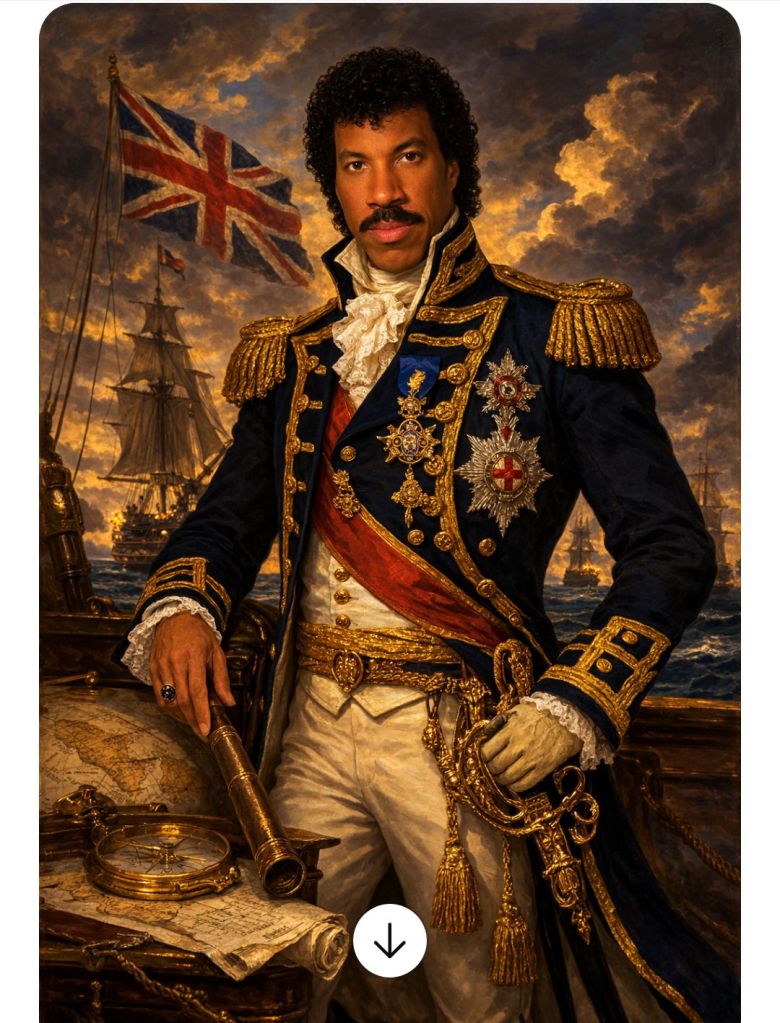 Behold Lionel Richie as an actual commodore in the British Navy. First attempt – nailed it!