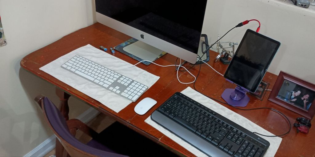 I also set up a little mirror behind the iMac to make it easier to see the USB ports! Sure, it would obviously be more convenient to put the damn things on the front of the screen, but no…Apple has to be all “aesthetic” and sh–! π